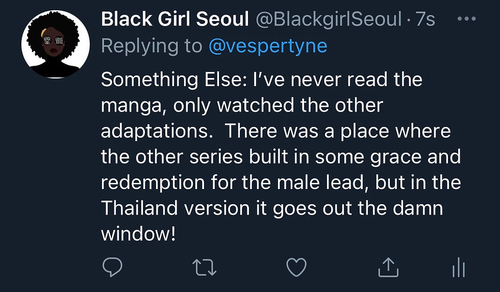 Watching this series was like being in a toxic relationship that you didn’t know was that bad until you were out of it. All the crazy shit was normalized. I’m not watching another adaptation unless it’s American (or I write it). I can thank F4 Thailand for pimp slapping the rose-colored glasses off my face. Boys Over Flowers has always been popular and iconic, but should it be? Maybe not. I'm sure other, better writers than I have dissected its pros and cons. But, there's nothing like the brutality of the Thai version to sour the whole franchise for me, especially after seeing Gorya be physically and emotionally terrorized repeatedly throughout this series.